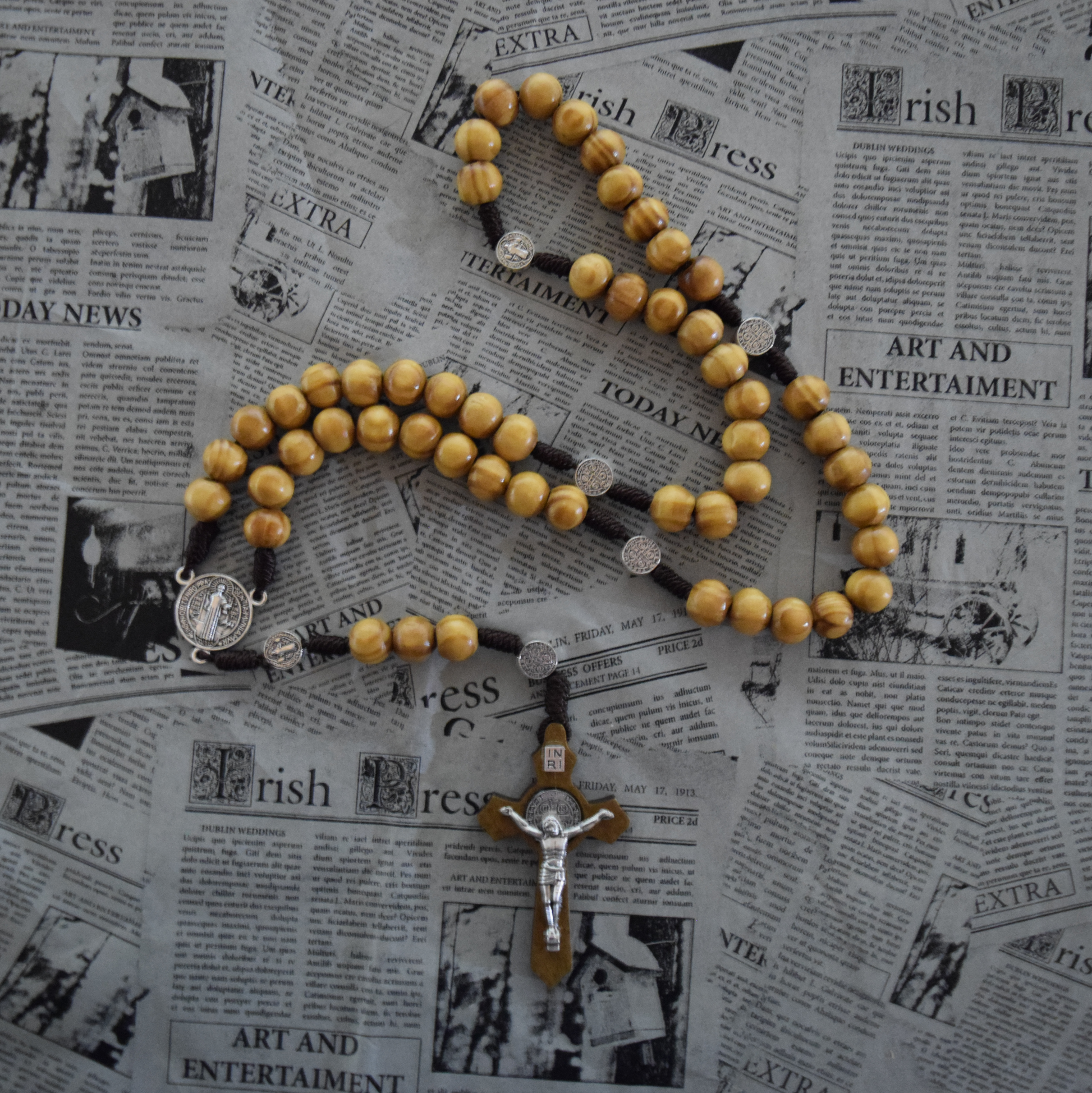 An 18” rosary featuring a 2” crucifix nail and 1” centerpiece